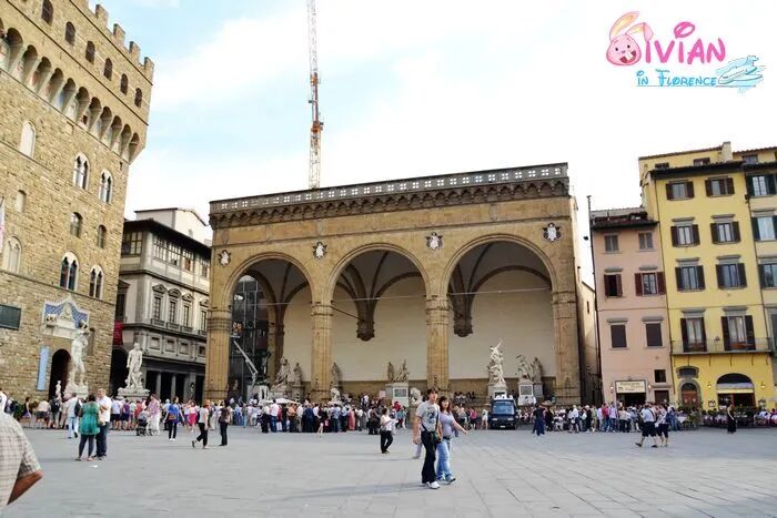 广场的敞廊中矗立着多种雕塑,展示了《科西莫一世》骑马塑像,《海神尼普顿》,米开朗琪罗的《大卫像》复制品(原作收藏在佛罗伦萨的阿卡德米亚美术馆)等等众多的雕像。
