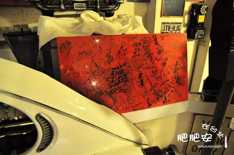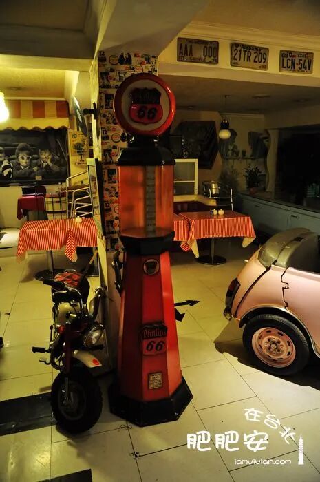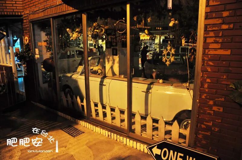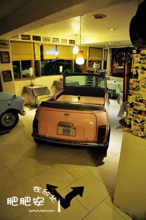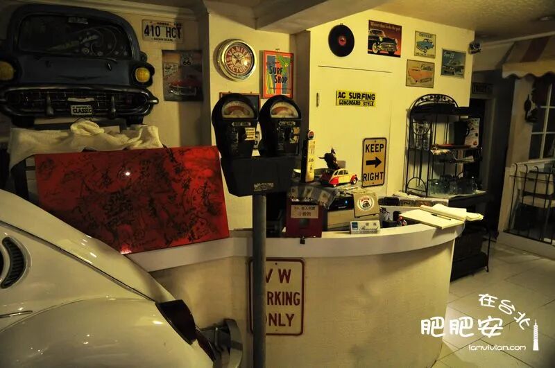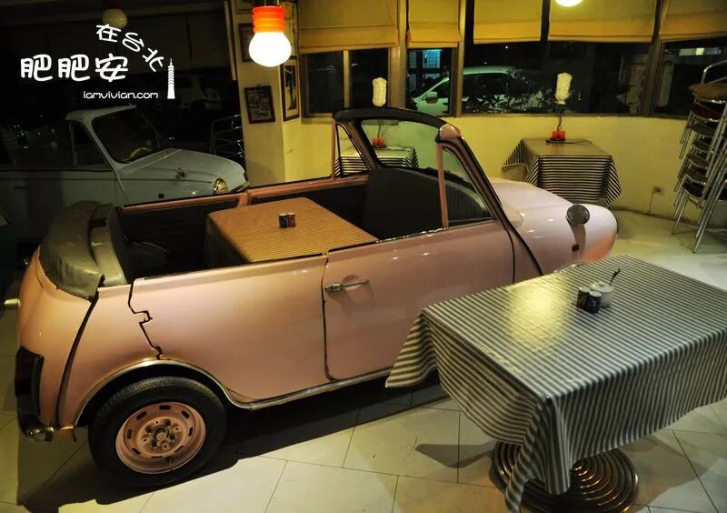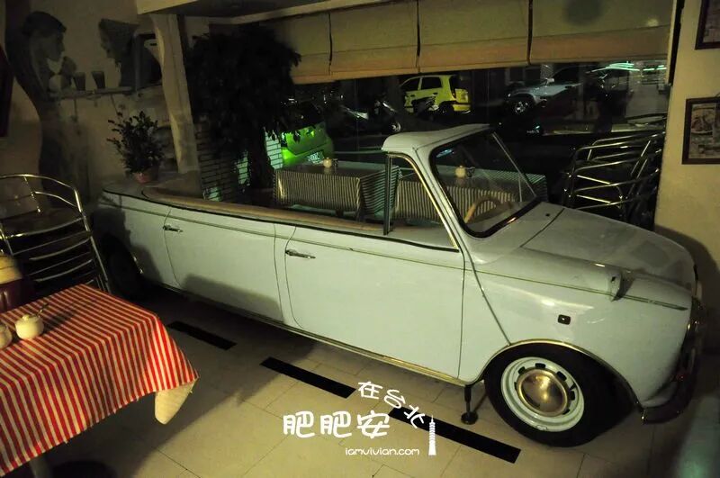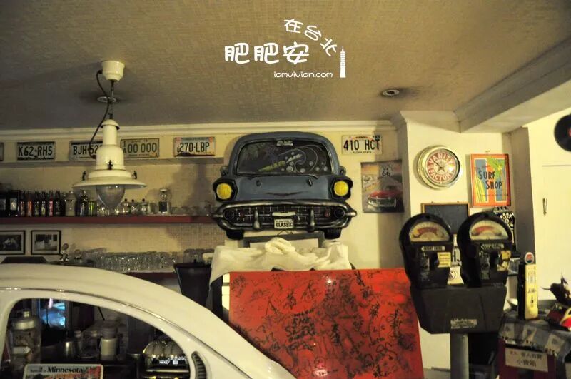 找到《流星花园》里杉菜和道明寺约会的汽车主题餐厅——金屋藏车,也叫P.S. Bu Bu 由于要去的店太多,网上地址的错误,跑错了地址,搭地铁坐到芝山站,再打车10分钟左右,110台币,22点才赶到这家店,已经打烊,善良的老板娘开门让我们拍照。