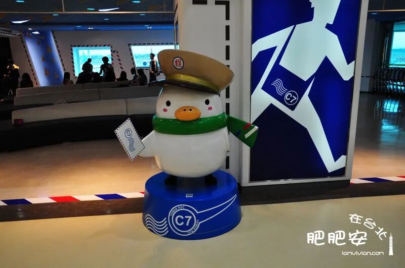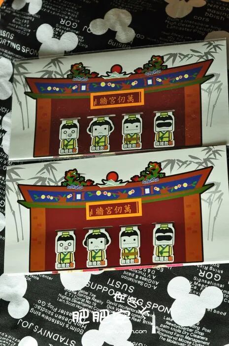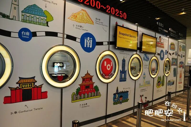 § 猫空缆车:以缆车车厢、指南宫大门、梯田及茶壶茶杯、企鹅和无尾熊为背景。