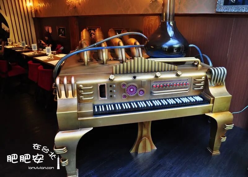 餐厅里装饰这各种汽车配件,餐桌则都由汽车改装