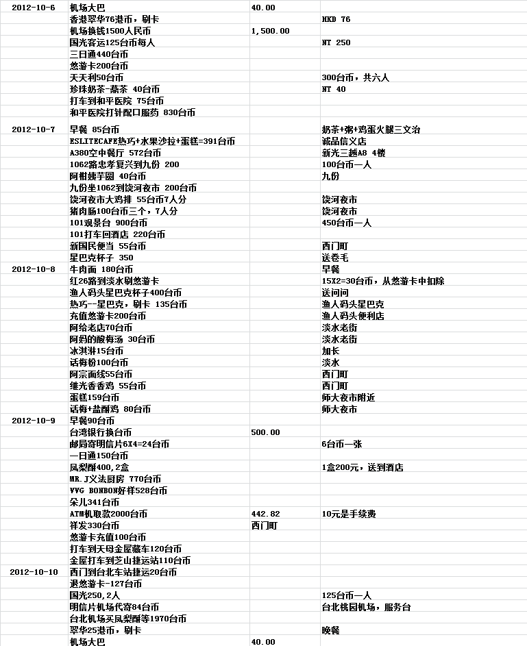 我们的行程是5天4晚,粗略计算了我们5天搭捷运所花的费用(App store里下载一个“8684地铁”,或者“台北地铁”,都可以查询站与站之间的费用) 还是买3天的440台币的悠游卡划算,但要注意,和HK的八达通卡不同的是,3天的悠游卡是从刷的那天开始计算,以天为单位,而不是以第一次刷的时间来算,也就是1号无论几点刷第一次,只能刷到3号的23:59.