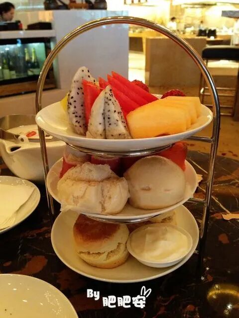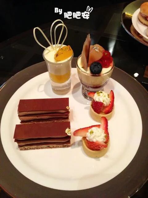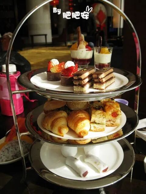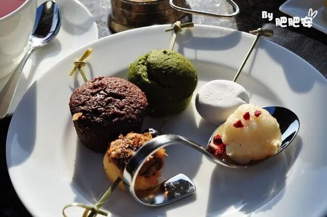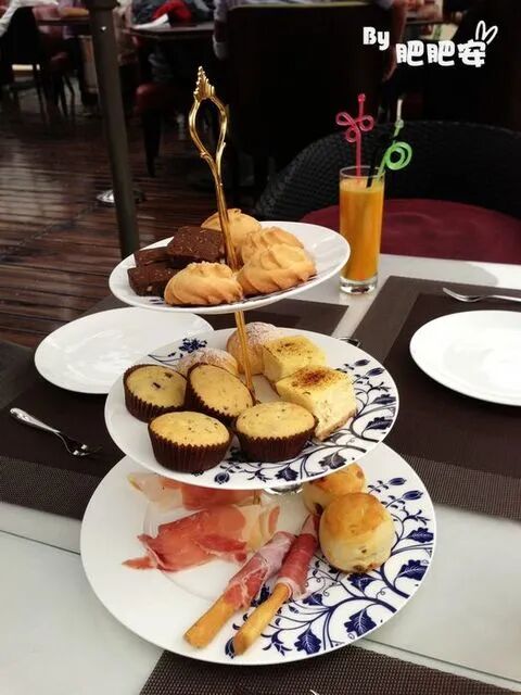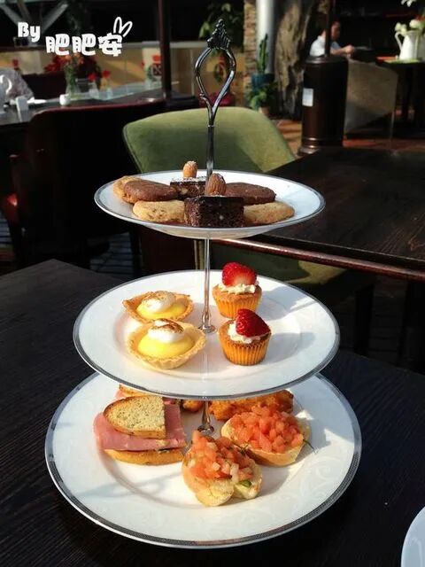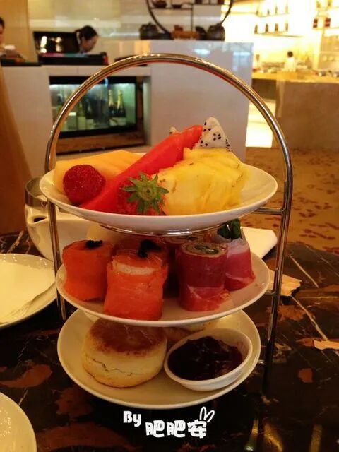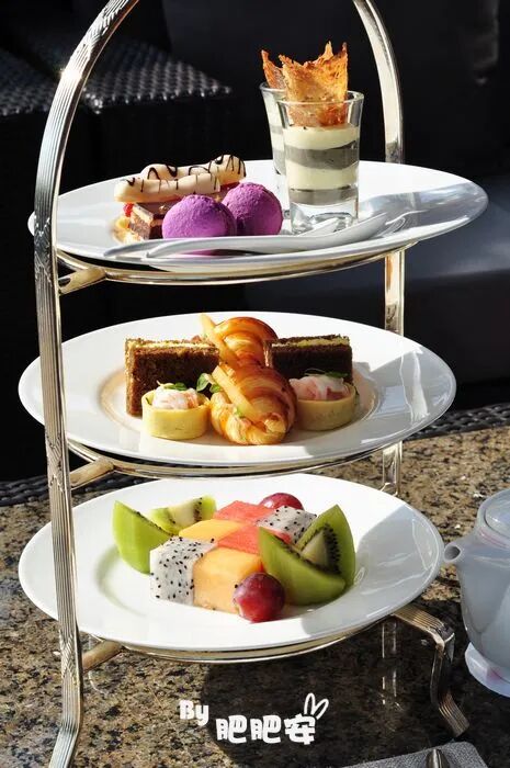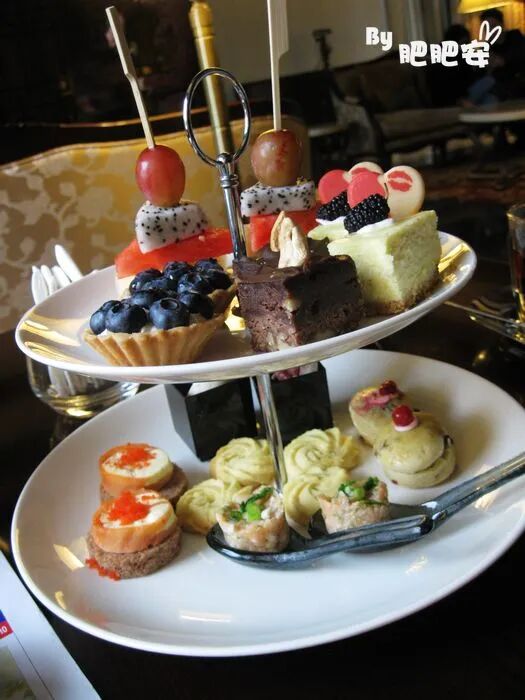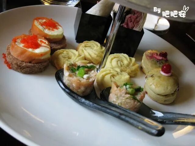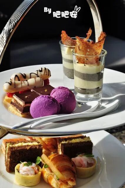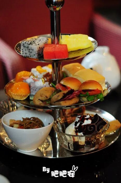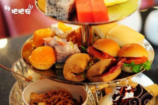 烟熏三文鱼三明治、番茄芝士三明治、牛肉三明治、香扒鸡肉串、猪肉菠菜春卷、中式海鲜炒面、各式甜点、时令水果、草莓或香草或巧克力冰淇淋一颗,任选一款茶或现磨咖啡。
