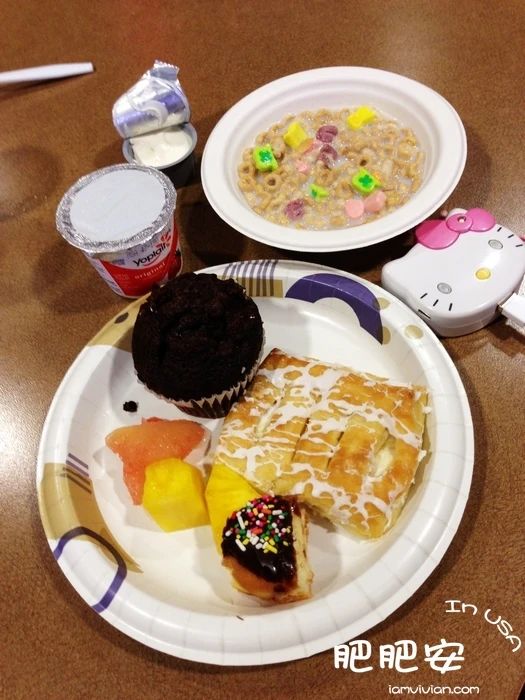 国外的早餐基本都是这样,冷牛奶、酸奶、面包、蛋糕、水果等等等