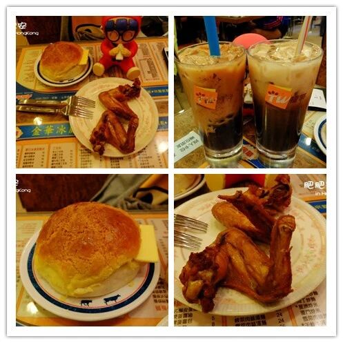 菠萝油8港币、炸鸡翼(2只)17港币、冻鸳鸯(少冰)16港币、奶茶红豆饼20港币