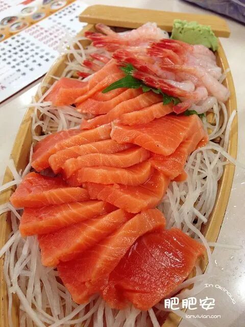 晚餐一,第一牧志公设市场,三文鱼刺身+甜虾 = 1700円
