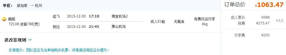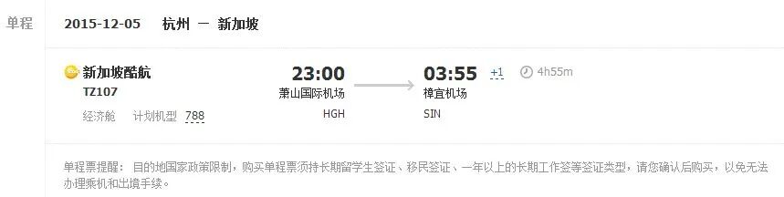 杭州飞新加坡(机票+税)854元;新加坡飞杭州(机票+税)863.47元