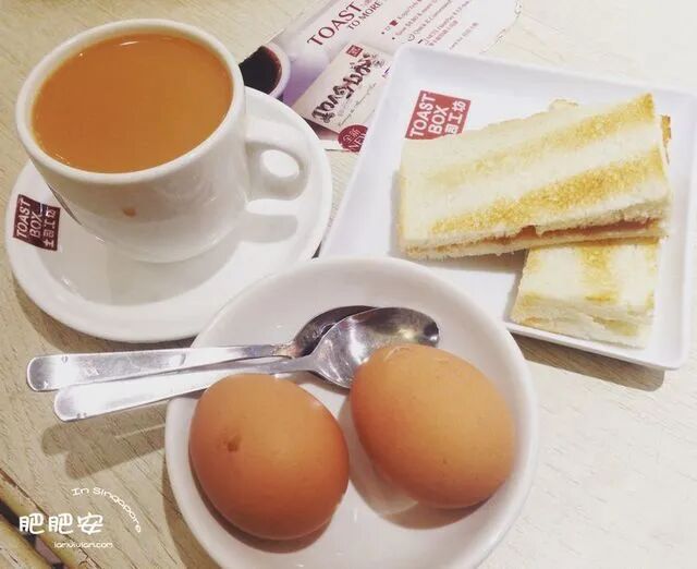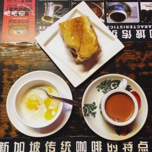 新加坡国民早餐小清新版,当属著名的“咖椰烤吐司+半生鸡蛋+南洋咖啡”的完美组合。