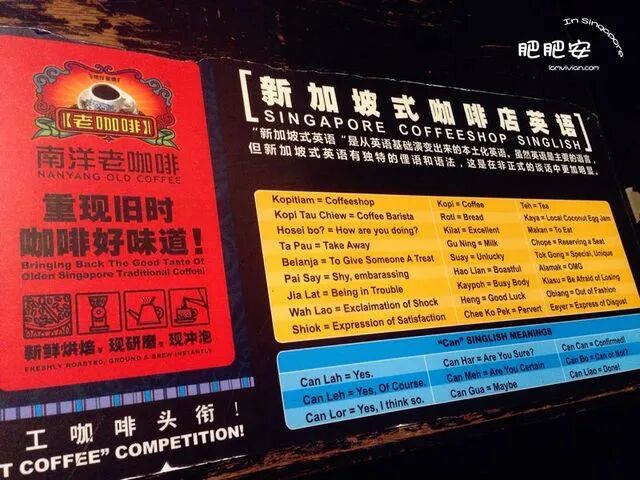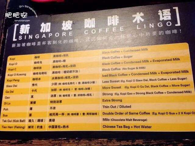 每张餐桌上贴有咖啡术语、新加坡式咖啡店英语。可刷支付宝哦。