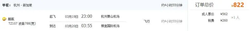 3月4日订杭州飞新加坡的机票,没有行李的人首选自然是酷航咯