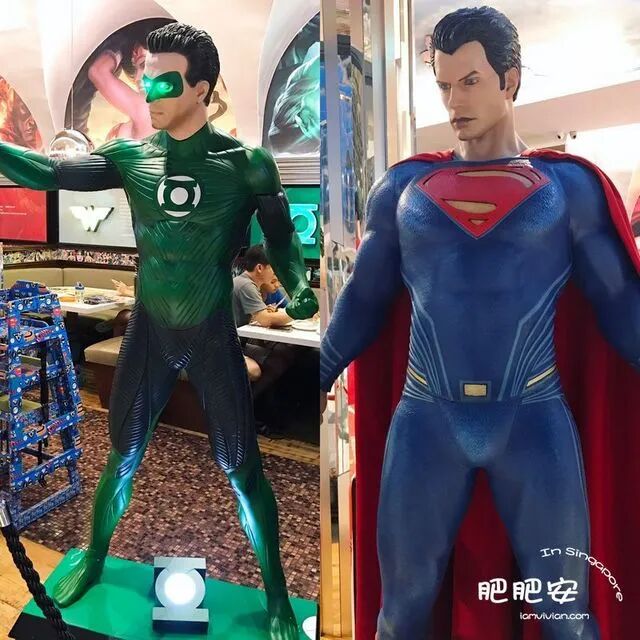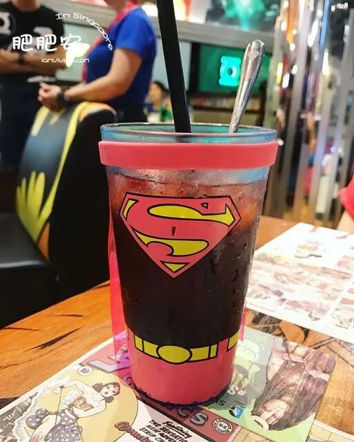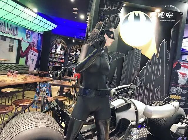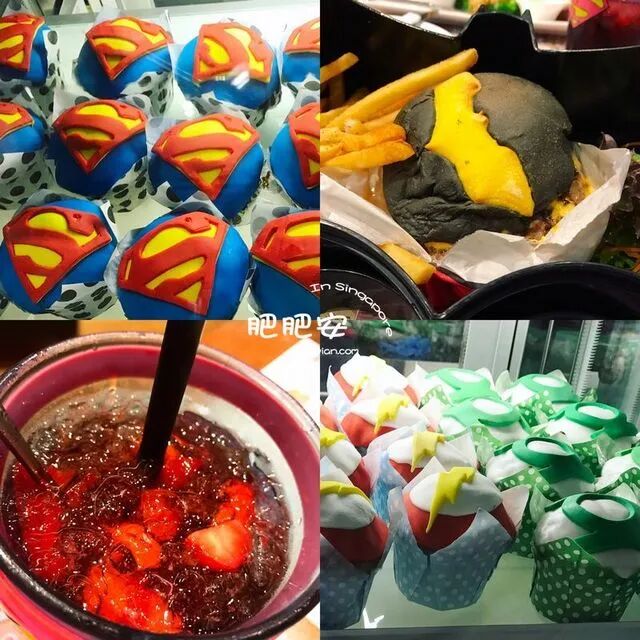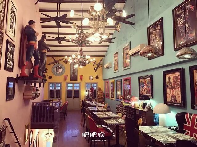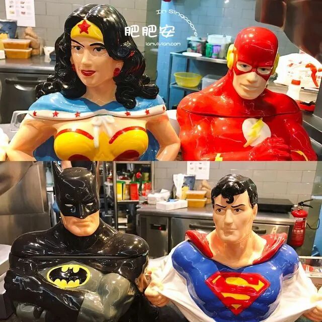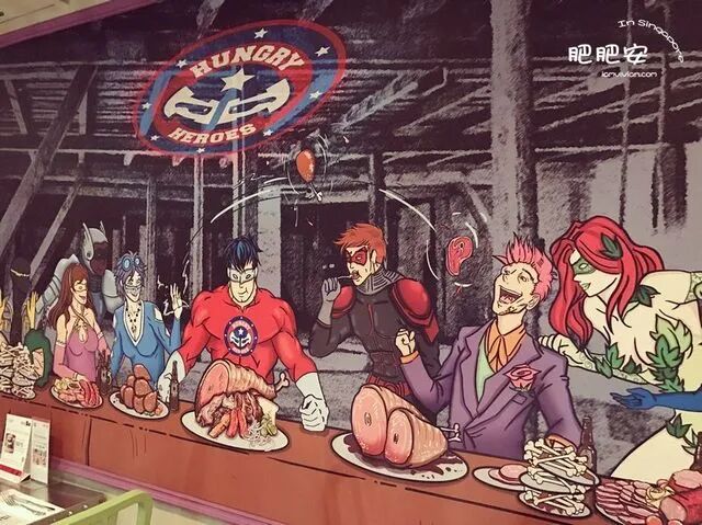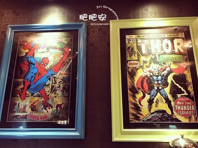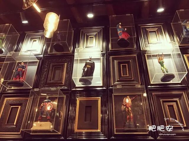 超级英雄也会饿哦,店内英雄们的雕像、各种电影海报及周边