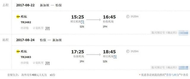 新加坡往返怡保机票总金额 ¥566.00 (机票价564元,税2元)