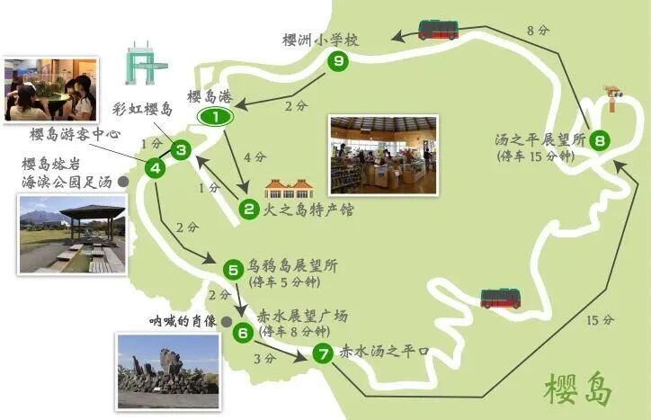 从樱岛港出发,途经乌鸦岛展望台,赤水展望广场,汤之平展望台,环岛一周,一览樱岛自然风光后回到樱岛港。