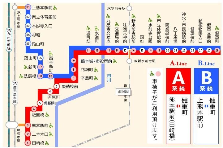 从JR熊本站:搭乘路面电车(熊本市电A系统各停健军町方向),在熊本城·市役所前站下车后步行17分钟