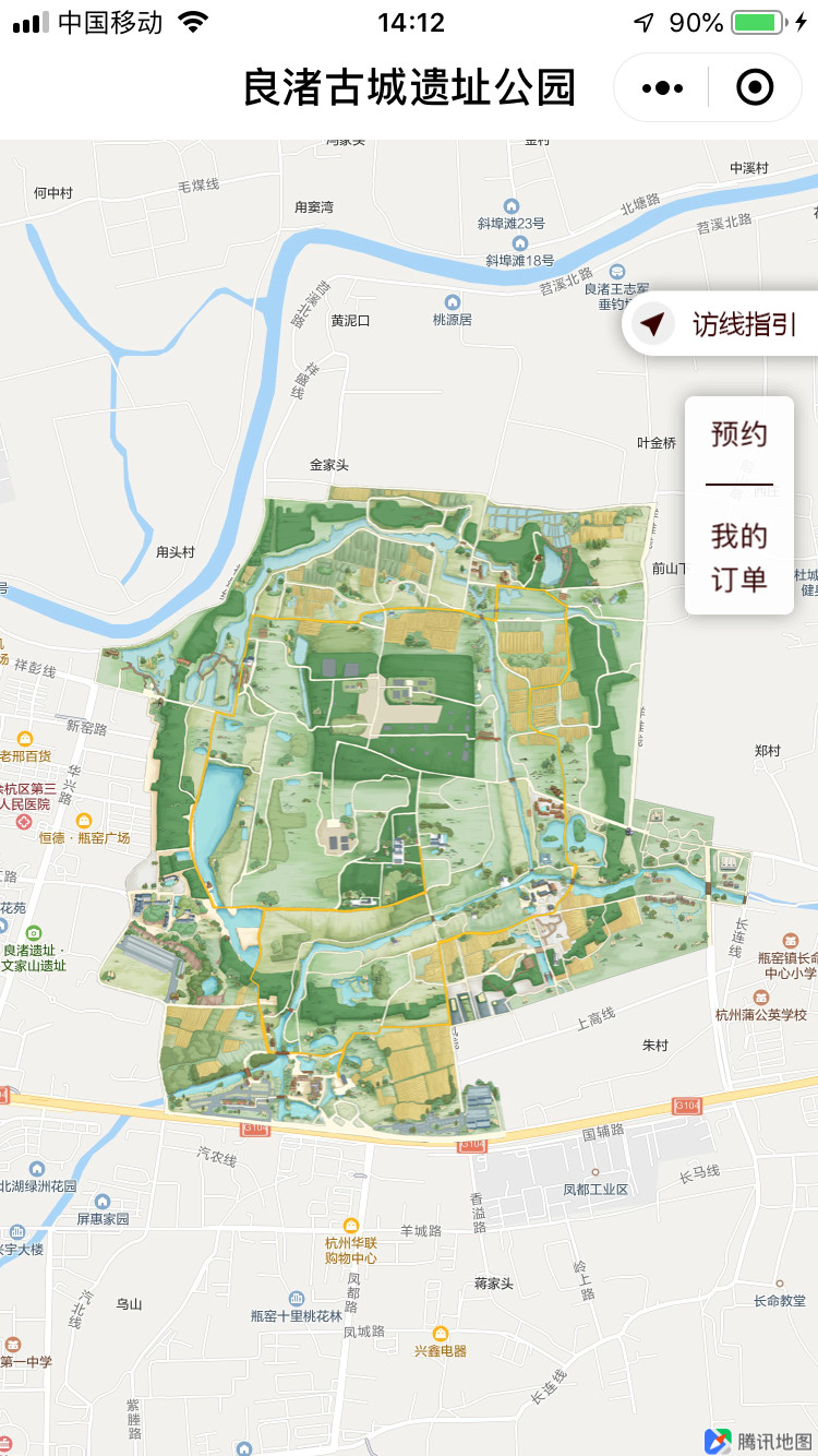 游客进入园区需通过“良渚古城遗址公园”微信公众号或小程序进行预约,团体预约需提前3-5天进行预约申请。个人预约时,需提供姓名、身份证号码、联系方式等信息,预约成功后,系统将自动发送预约成功消息,每张身份证每天只能预约1张参访券,此券当天有效,过期作废。按预约的时间段前往访客中心,在机器上刷身份证并拍照后领取参访券。保存好参访券,入园出园都需扫描参访券。园内各站点均由观光电瓶车接驳。