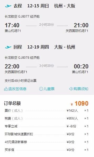 杭州往返大阪每人限带2件托运行李,1件手提行李5KG。