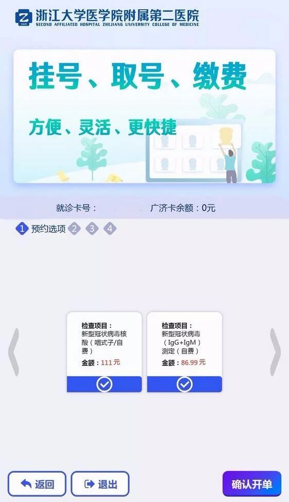选择咽拭子111元,确认开单,扣取广济卡或医保卡内余额。