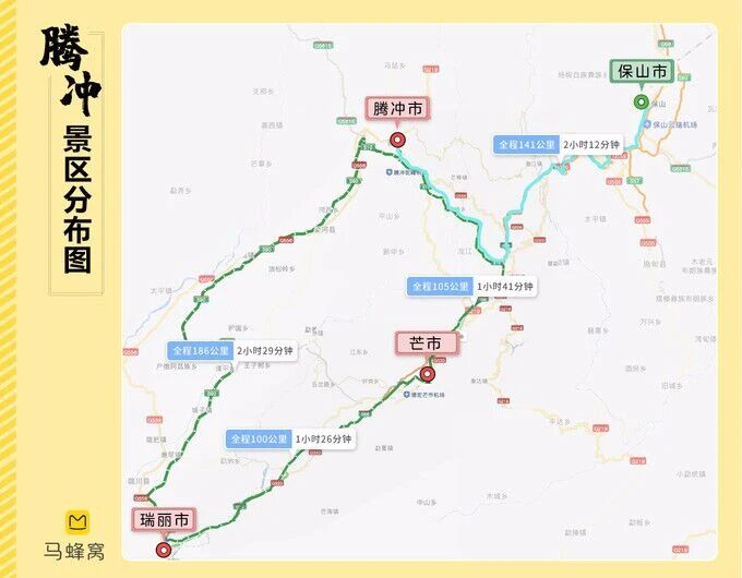 和顺古镇、火山热海、北海湿地、大滚锅 、叠水河瀑布、国殇园 、高黎贡山 、银杏村、云峰山。
