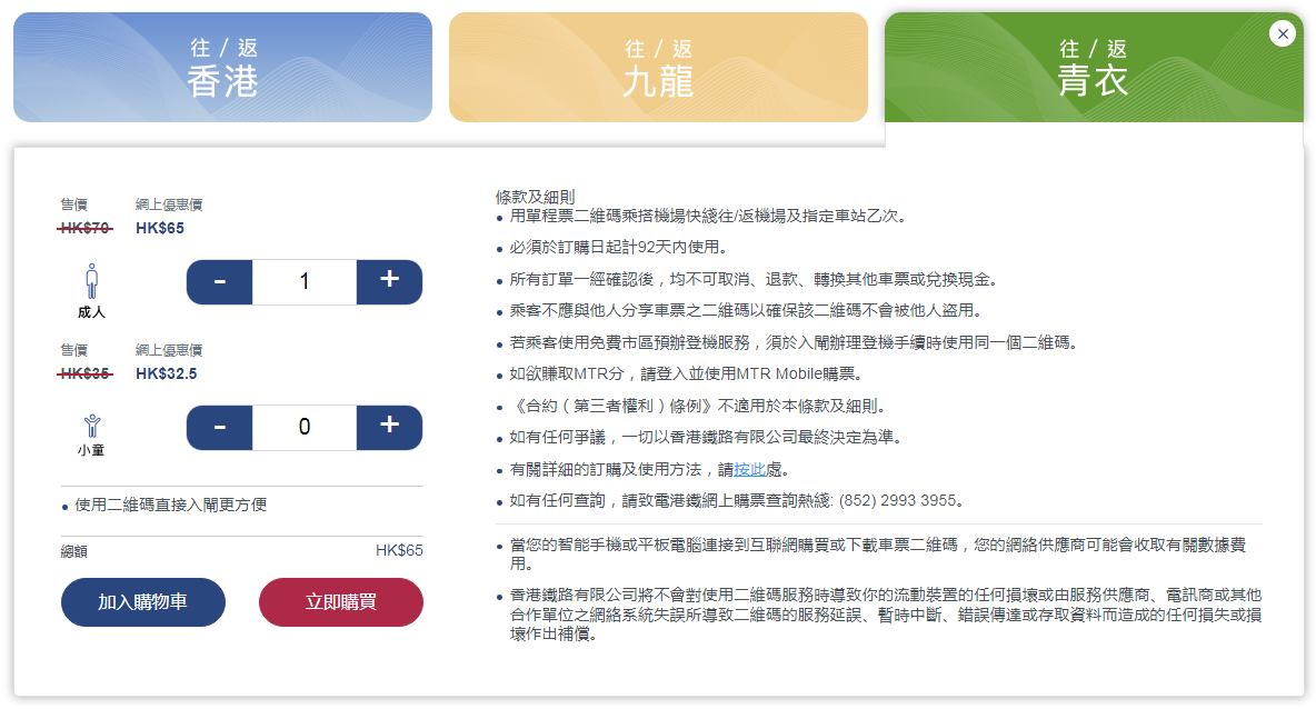 机场快线青衣站单程,原价HK$70,网上优惠价HK$65。