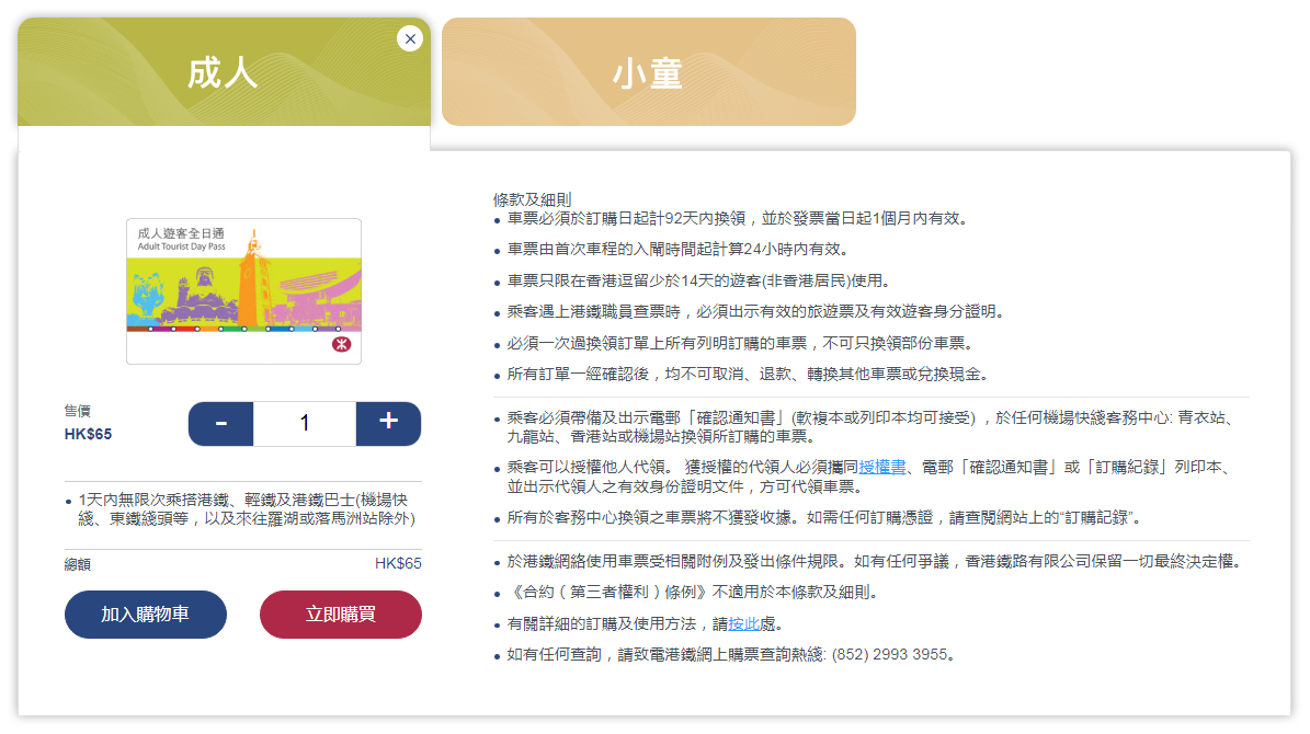游客全日通,成人HK$65,小童HK$30。