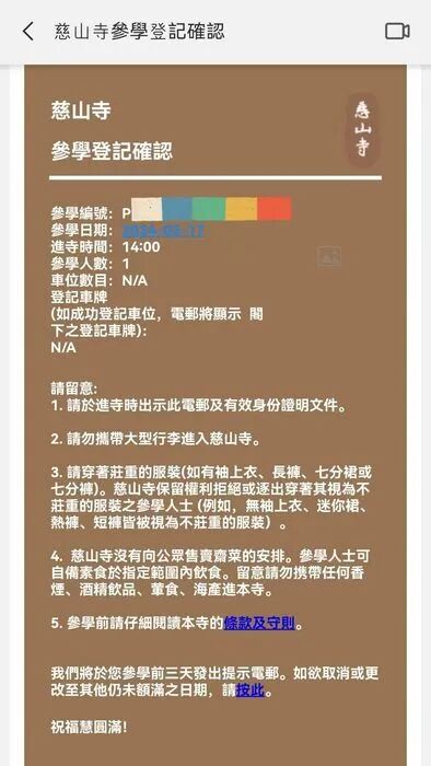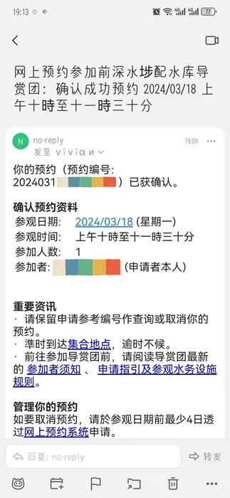 预约成功后,将会收到邮件,内有预约编号、参观日期和时间,集合解散地点。